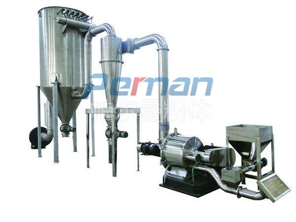 物料由加料系統(tǒng)均勻的送入粉碎室受到高速旋轉(zhuǎn)的粉碎盤的強(qiáng)烈沖擊,同時(shí)受到離心力的作用,與粉碎齒圈發(fā)生碰撞,受到剪切、摩擦、碰撞等多種綜合力的作用,使物料粉碎,被粉碎的物料隨氣流運(yùn)動到分級區(qū),通過變頻調(diào)節(jié)的分級輪,對粗細(xì)物料進(jìn)行分離,符合細(xì)度要求的產(chǎn)品隨氣流進(jìn)入旋風(fēng)收集器和除塵器收集,粗物料返回分級區(qū)二次粉碎。