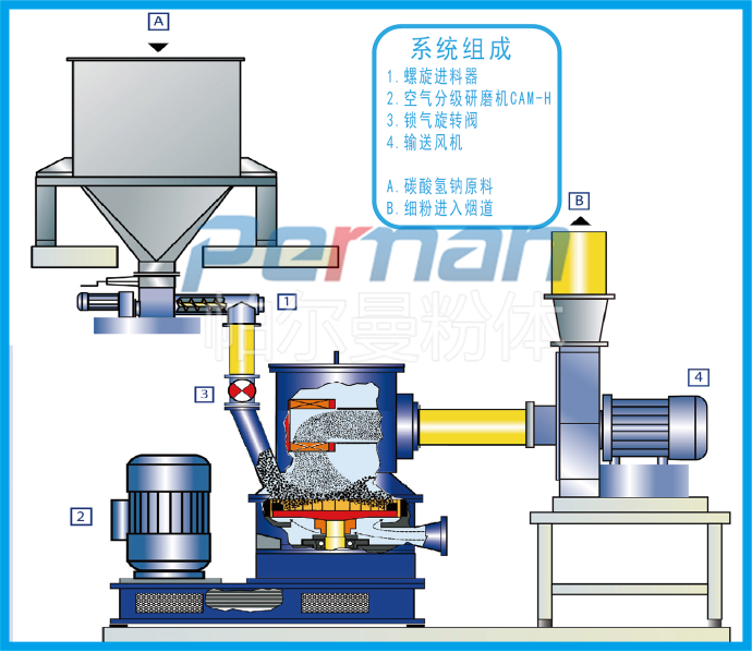碳酸氫鈉通過失重螺旋喂料稱定量均勻喂料進入CAM空氣分級磨,通過高速旋轉的磨塊與齒圈形成碰撞,摩擦,剪切多種作用力下粉碎,粉碎后隨氣流進入分級區,合格的物料通過分級輪進入煙道進行反應,粗料落入粉碎區繼續粉碎,顆粒的大小可調整分級輪的轉速獲得。